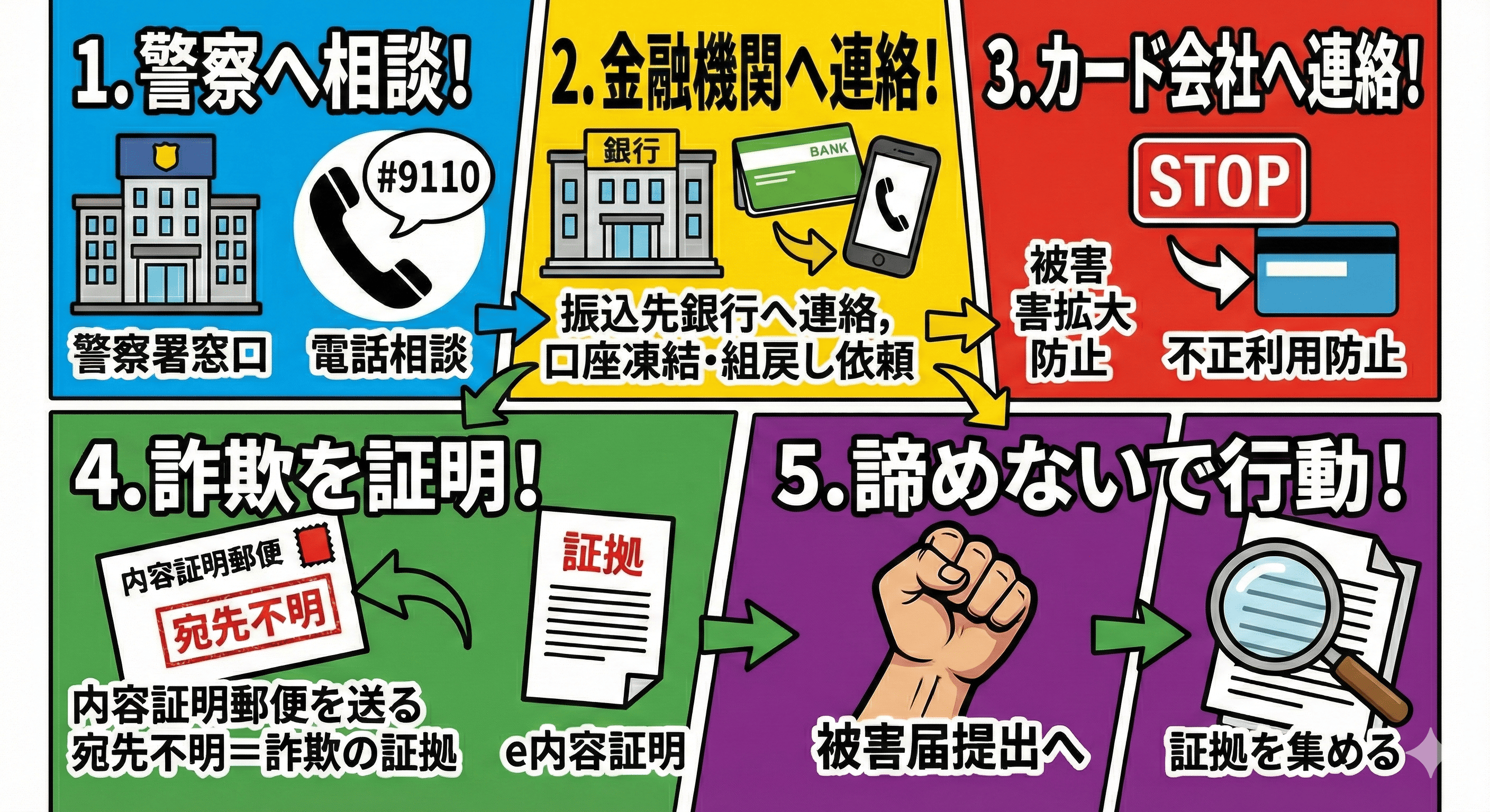 金融機関と警察への連絡で初動は完了ですが、被害届を正式に受理してもらうには『相手に騙す意図があったこと』を証明する必要があります。