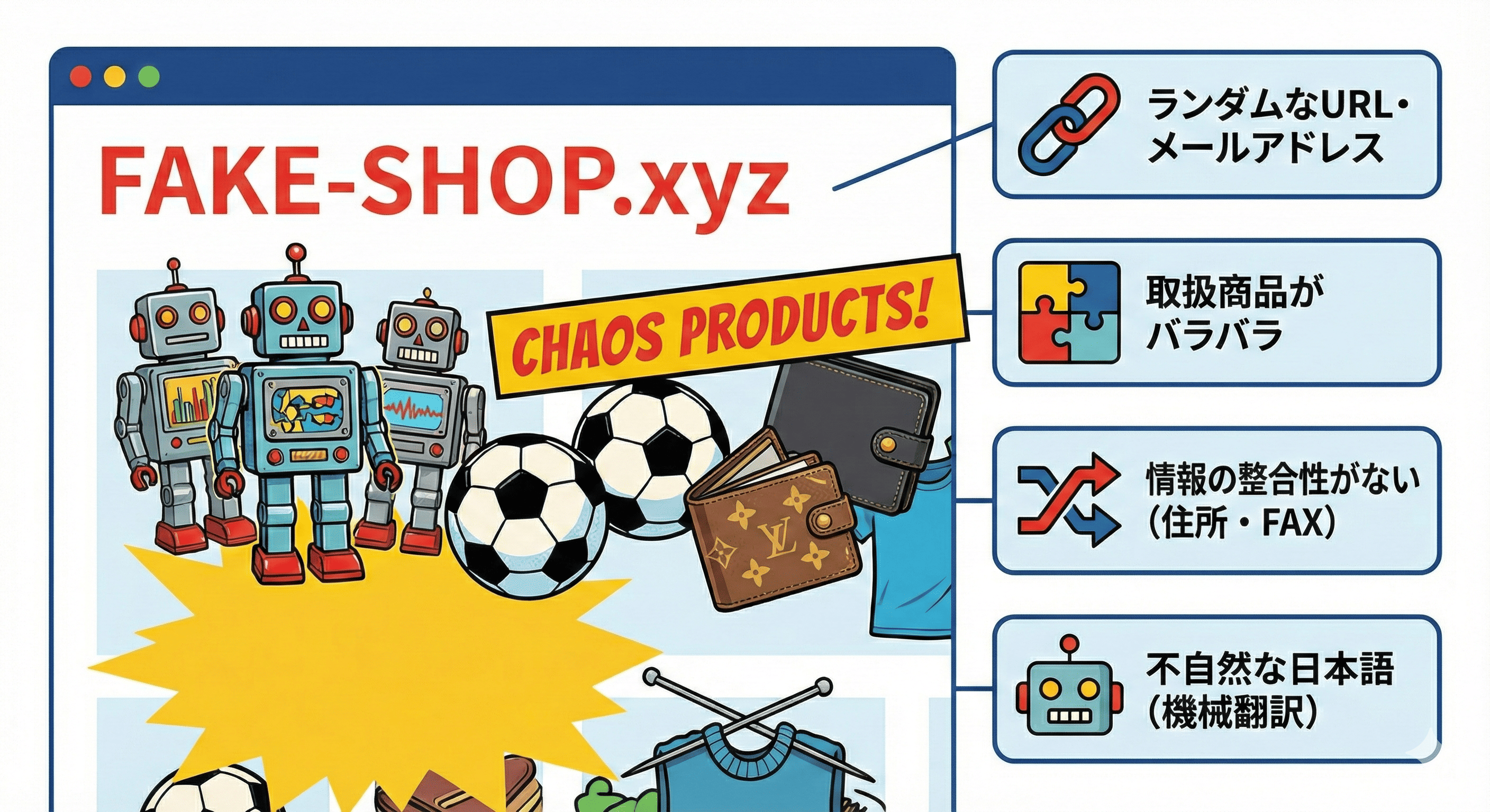 おもちゃからスポーツ用品、手芸雑貨までカオスな品揃え。おそらく、フリマサイト等のデータをスクリプトでコピーしてコンテンツを作っているのでしょう。また、URLやメールアドレスのドメインがランダムな英数字の羅列で、使い捨てドメインの典型的なパターンでした。